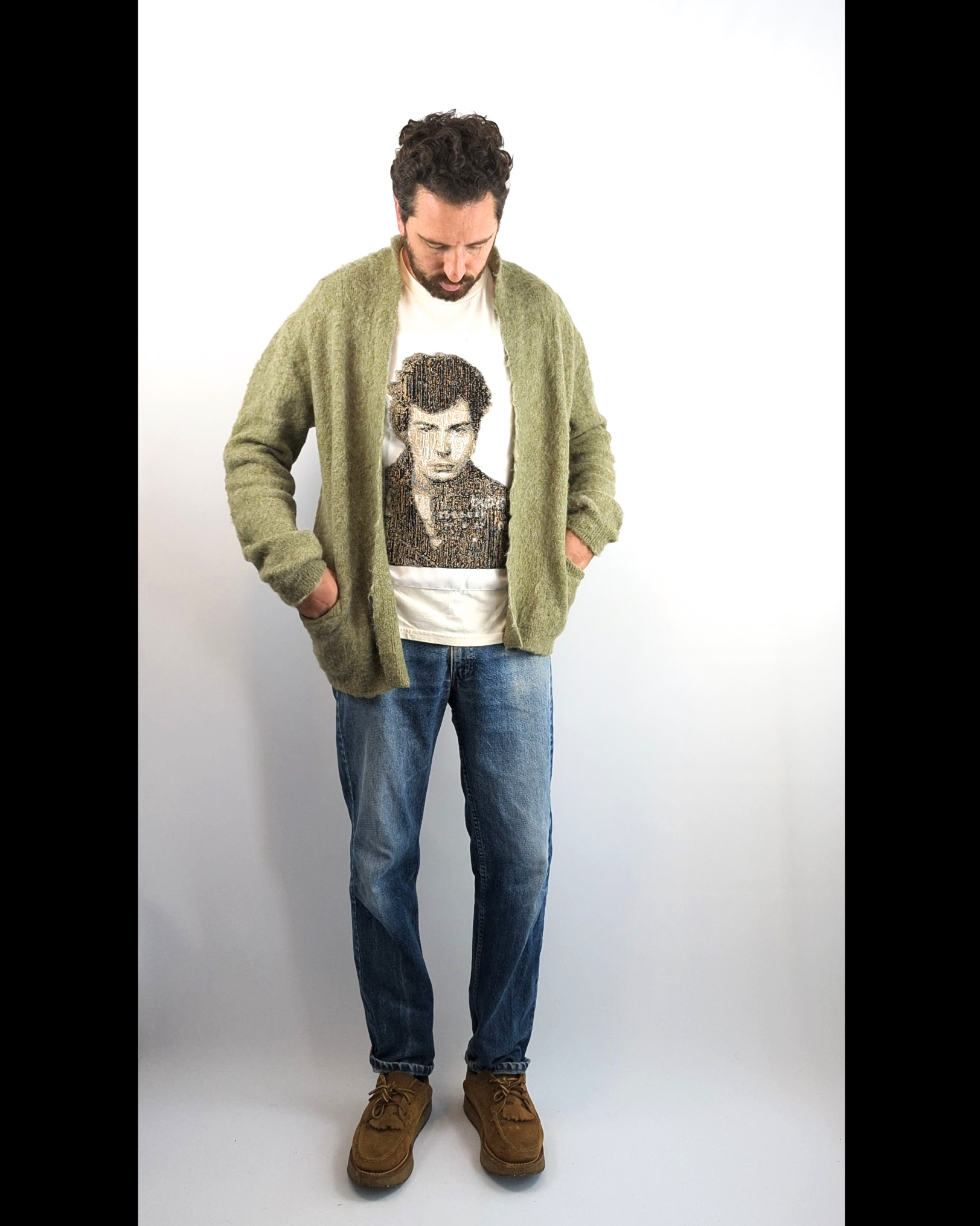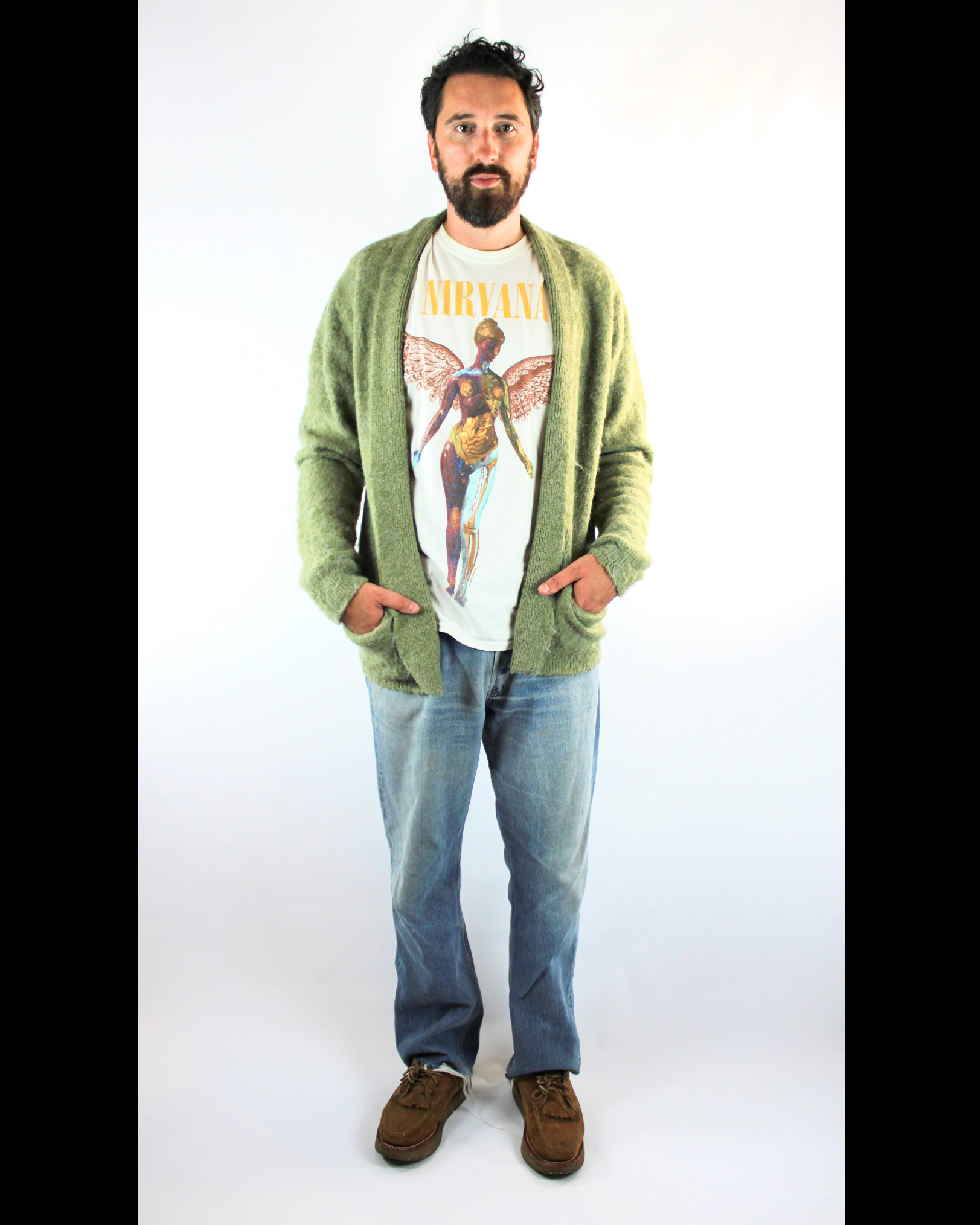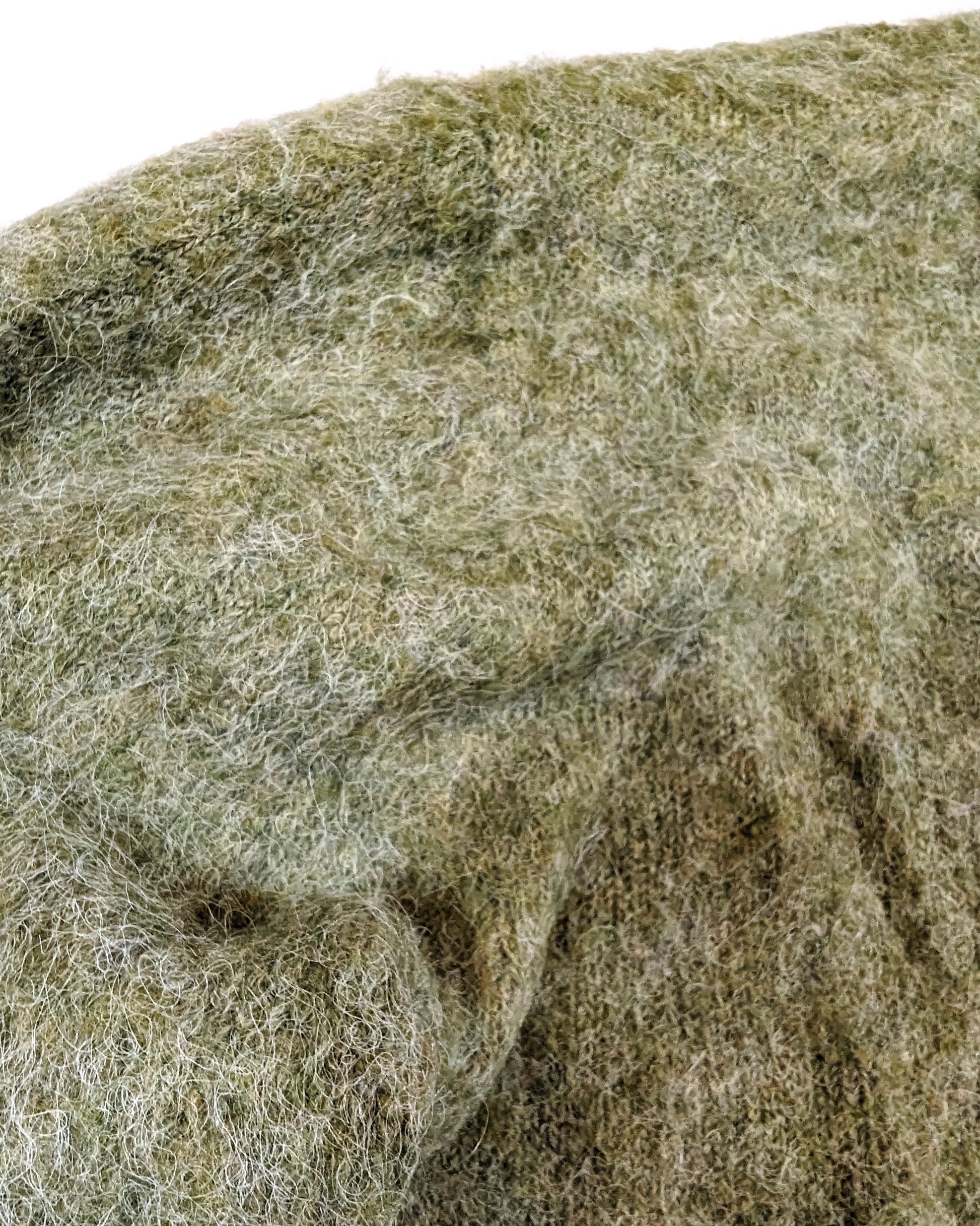 CARDIGAN IN SOFT MOHAIR BLEND. TWO PATCH FRONT POCKETS. RAW HEM SHAWL FOR TWO LOOKS.